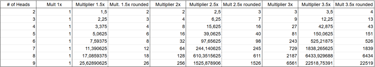 I did a statistics run to find out about the “heads combo mult”-values’ calculation. Here are my results