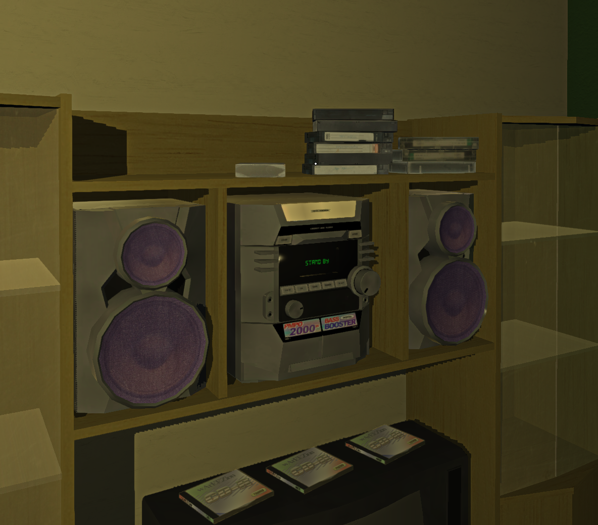 You can play music at home bass boosted found in the living room opposite the blue sofa.