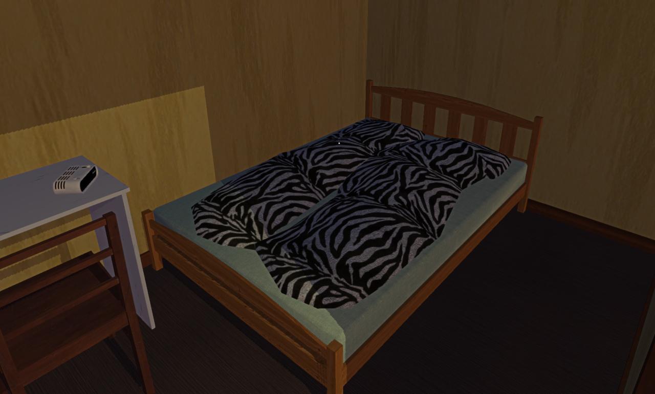 Your bed is in your bedroom, Hold F to sleep. You may not be able to sleep, this may be because of two reasons, Your house is too cold (It takes a long time to warm up), Or your fatigue is not low enough to sleep.