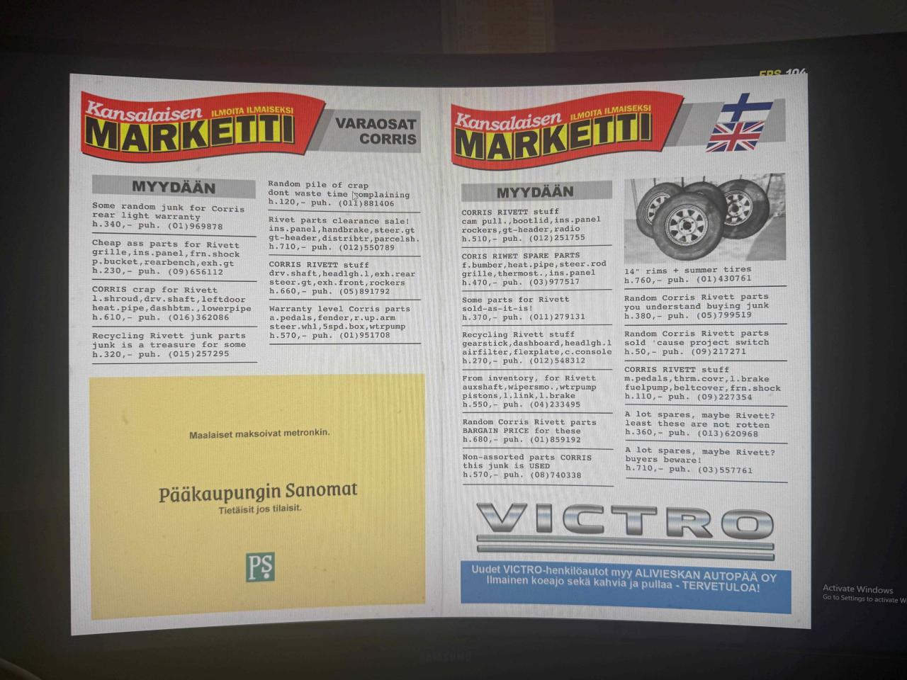 You can find the catalogue of parts in the fuel station shop, it costs 15mk, and is on a small shelf opposite all the car parts. They are used, and all the listings are approximately 10,000mk.