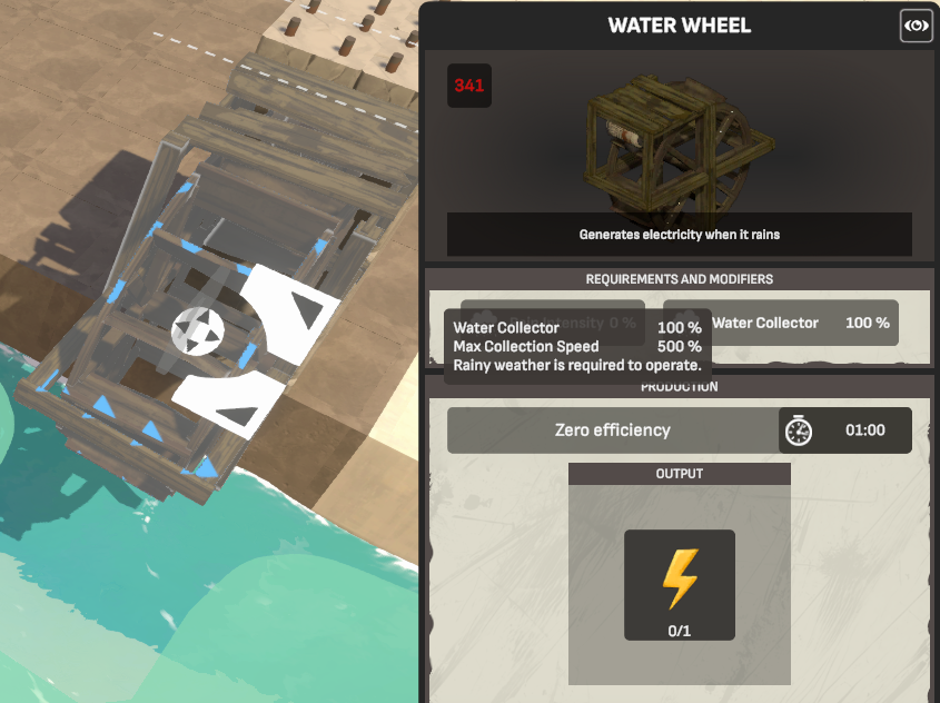 A few structures in the game work by collecting rainwater, which shows up during Rainy, High Tide, and Storm weather events. These are the Raincatcher, Water Wheel, and Pumpkin Farm, which each have a Water Collector stat when selected.