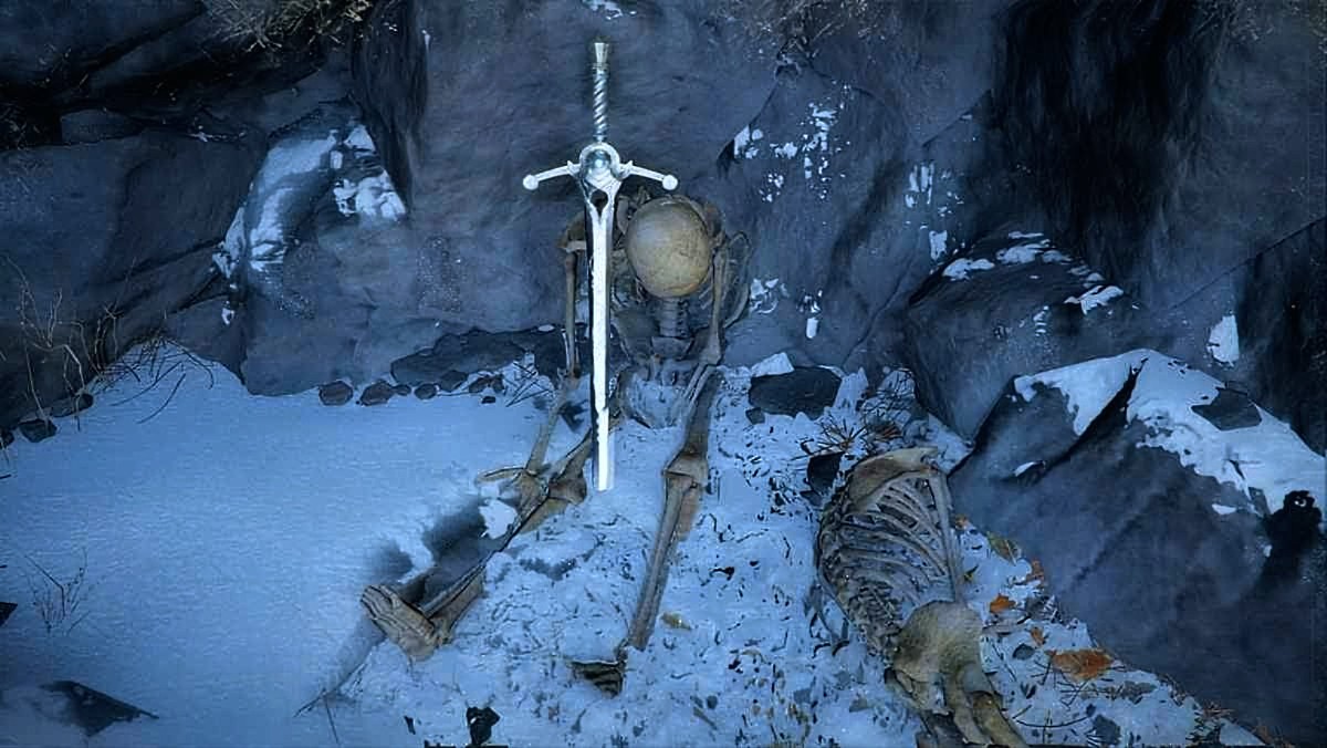 • Go through the narrow path between the mountains to reach the Snowhaven Hearth snow field. Go straight through the arena to the other side and look for a skeleton holding the Chillfallen Sword. Interact with the Chillfallen Sword to pick it up.