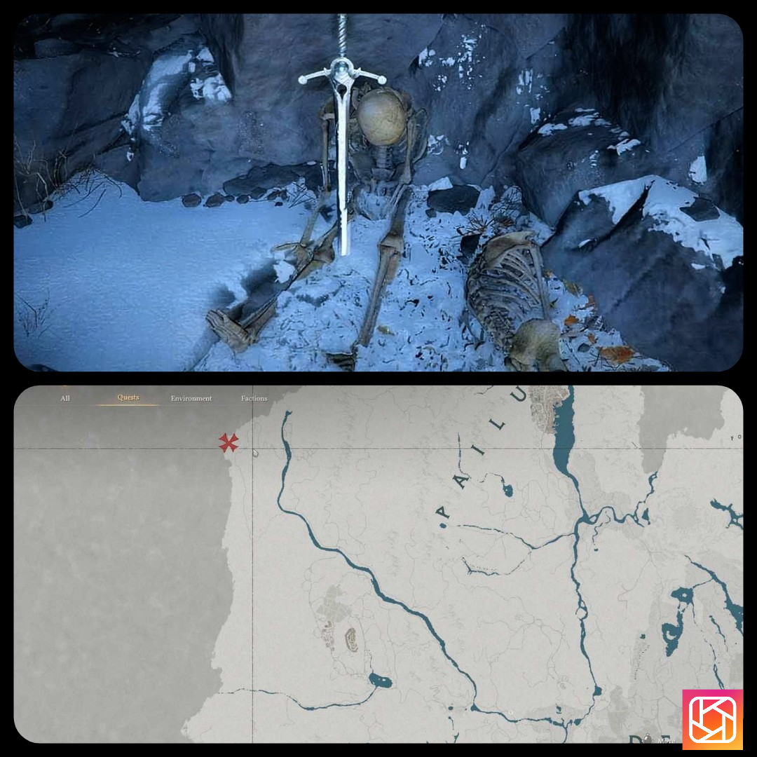 • The Chillfallen Sword can be found in the arms of a skeleton nestled in the corner of a large open snow field west of Pailune, near the First-Finger Lake at the very edge of the map. It can be obtained right at the very start of the game without defeating any bosses or solving any puzzles.